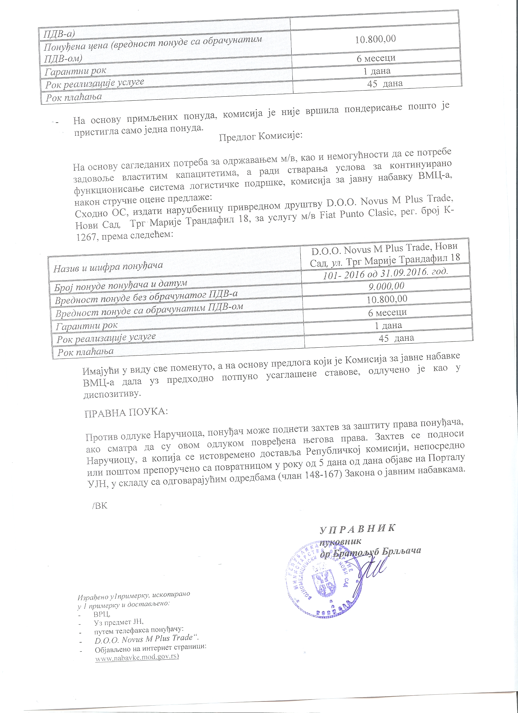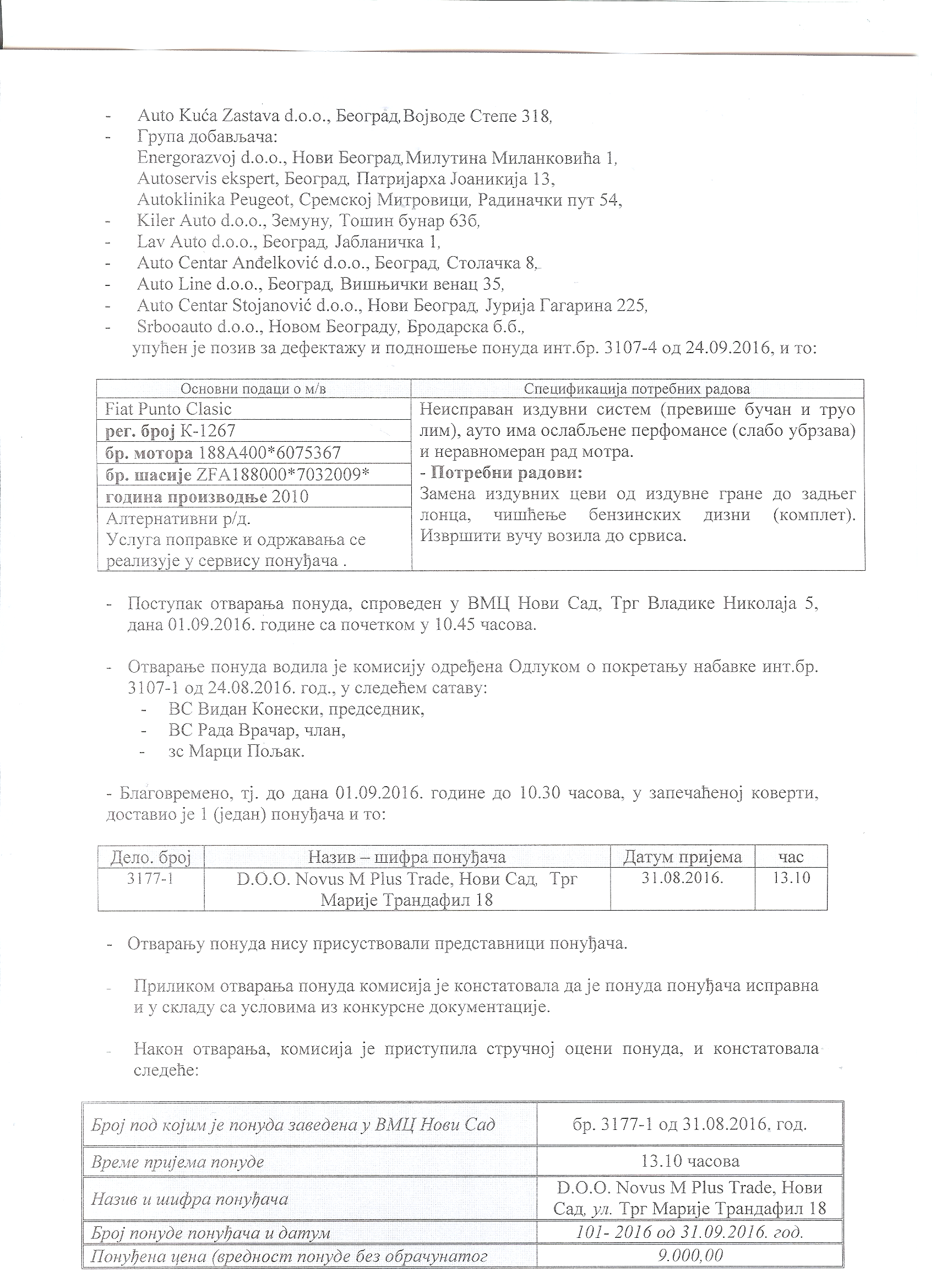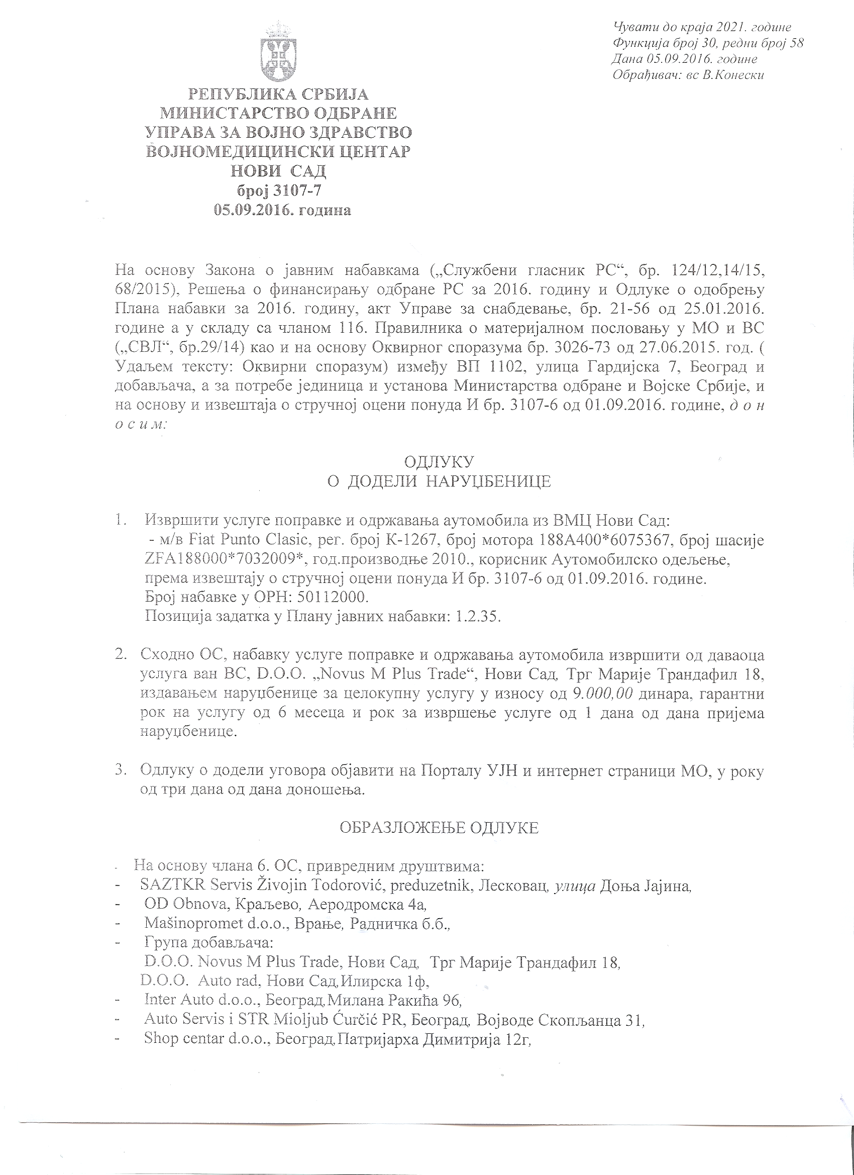 Одлука о додели наруџбенице за услугу поправке м/в Фиат Пунто класик